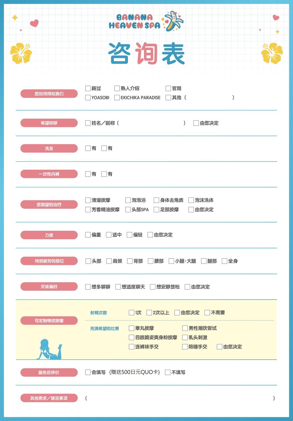 在敝店,我们会使用这份表格,与理疗师一同决定服务内容。