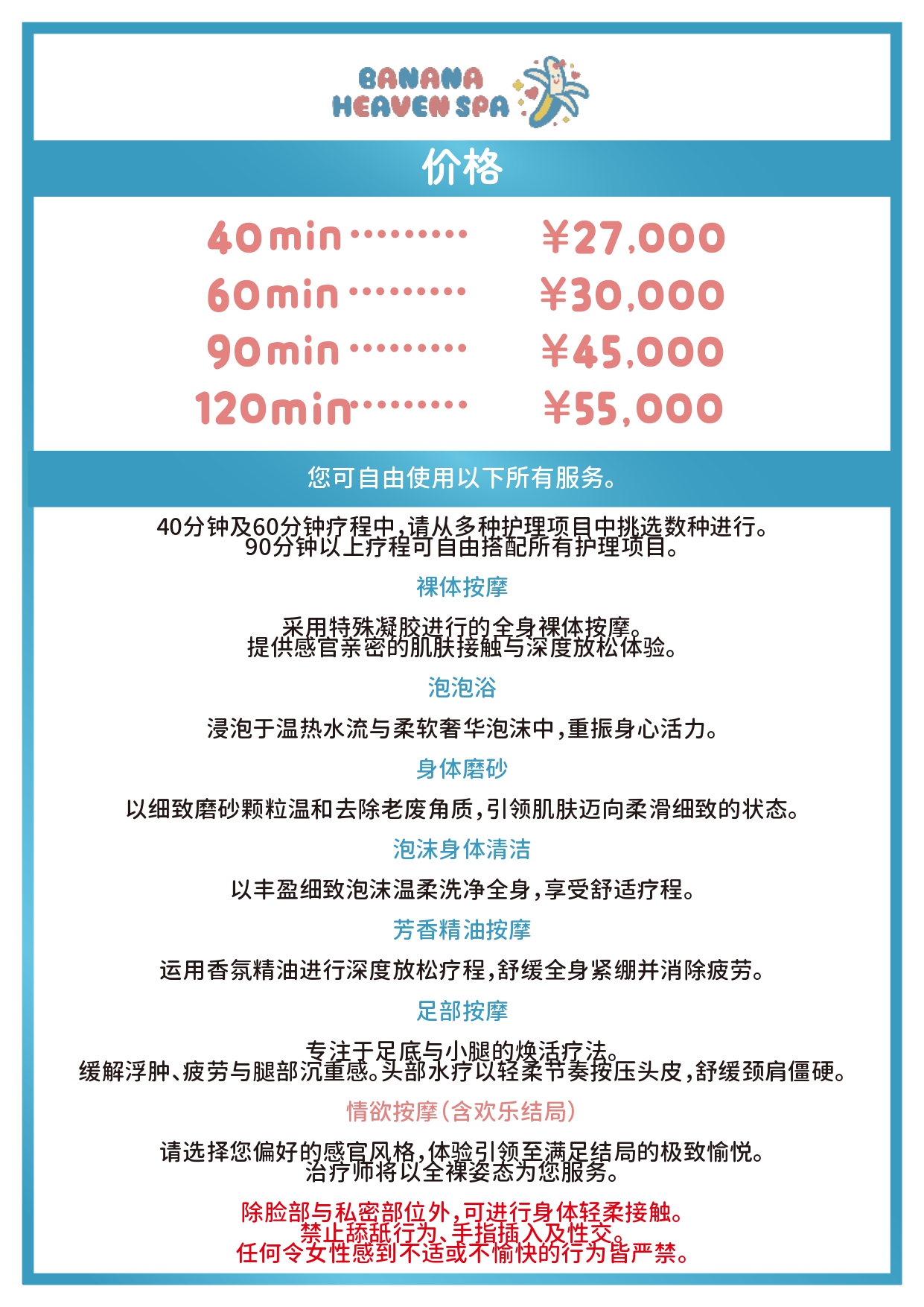 在本店,水疗菜单和性感按摩都可以自由定制。