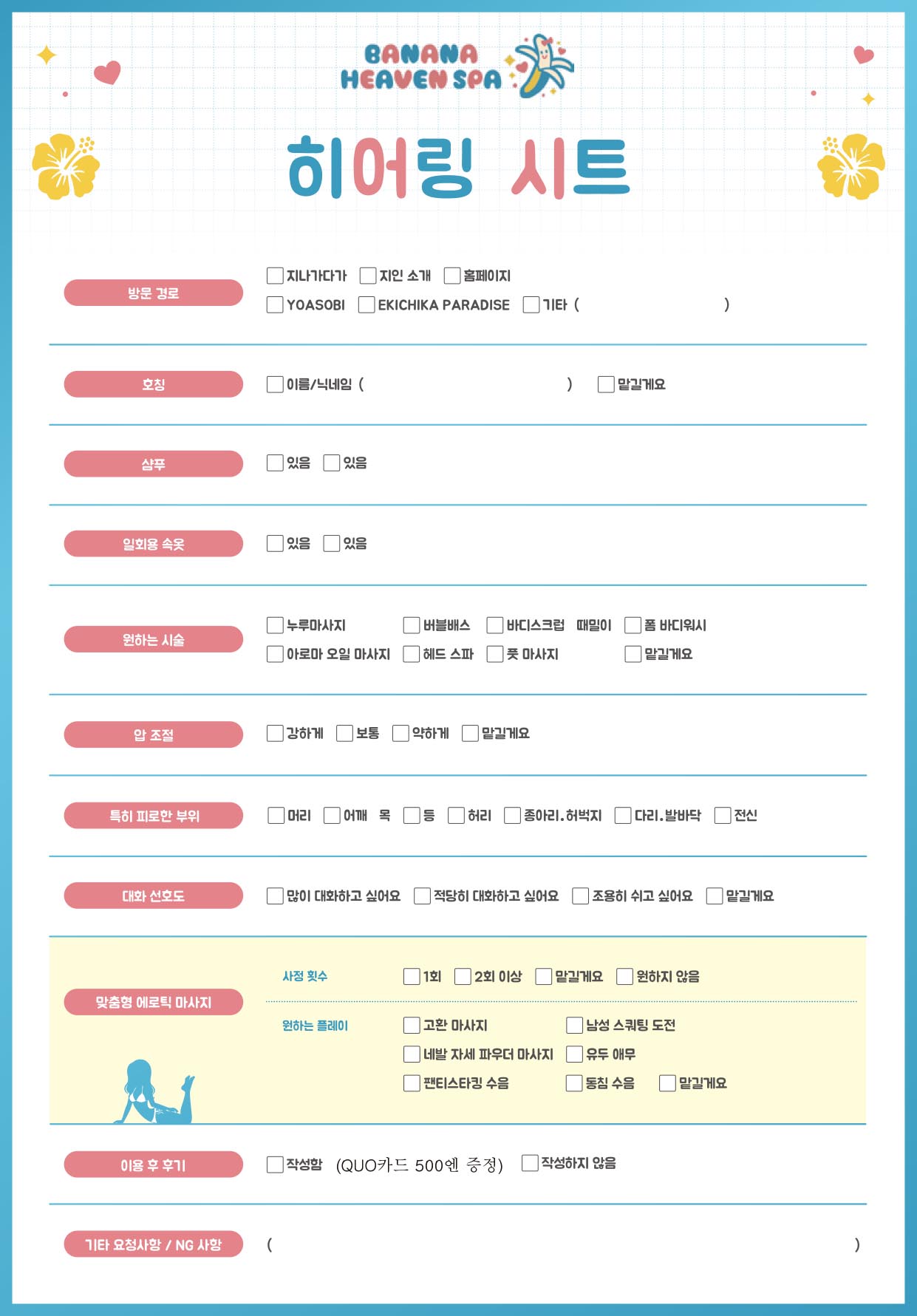 저희 가게에서는 스파 메뉴와 성감 마사지 모두 자유롭게 맞춤 설정하실 수 있습니다.